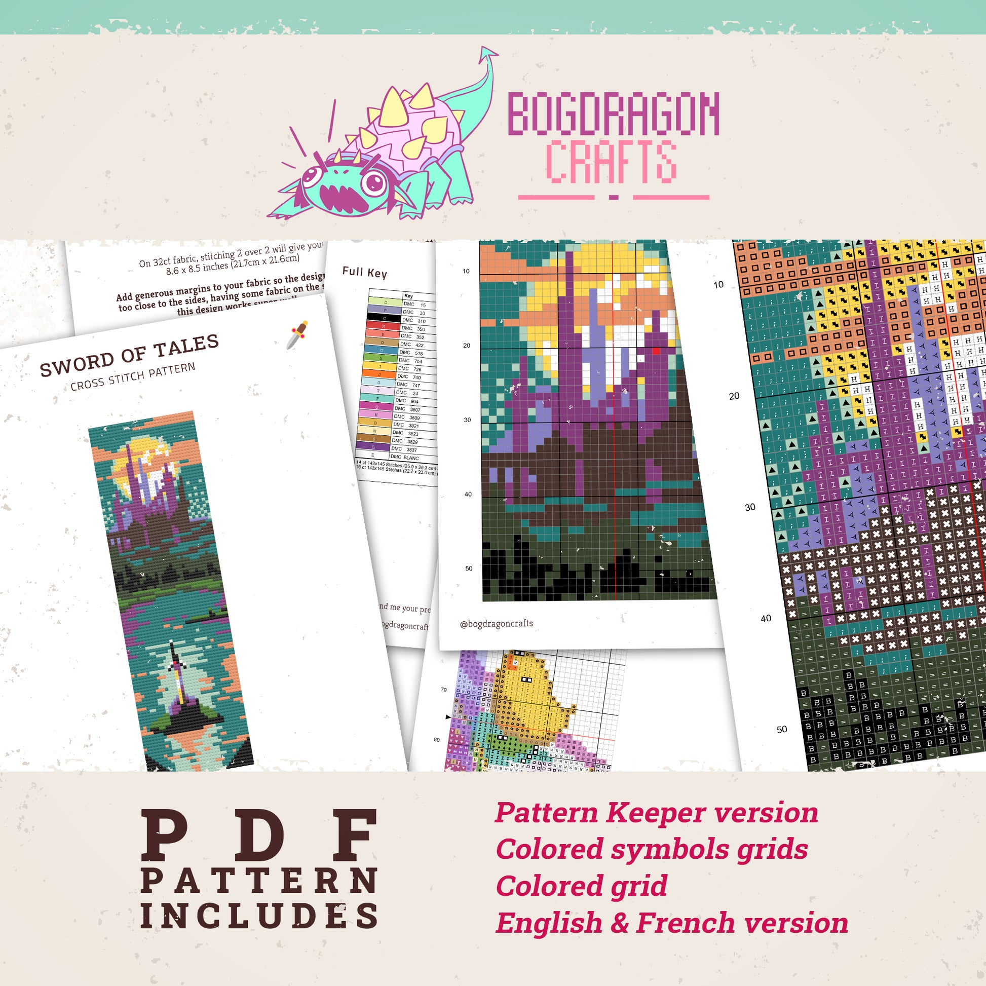 Digital cross-stitch pattern in pdf, a cute and modern cross stitch for a bookmark made for the Spellbound Stitches volume 3 the the incredible Badstitched and friends. The theme was fantasy, so I chose a scene inspired by the Excalibur dark fantasy stories: Legendborn and Bloodmarked come to mind.